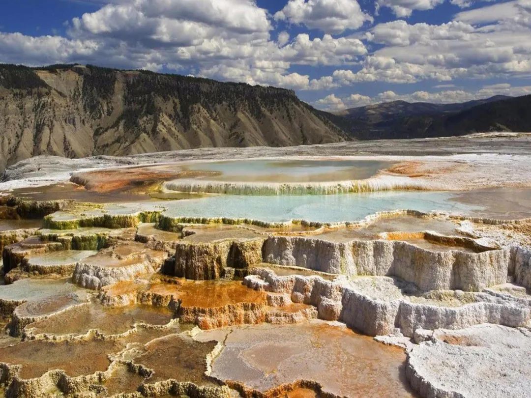 猛犸象温泉是世界上已探明的最大的碳酸盐沉积温泉,位于公园的北部。温泉的颜色呈现出棕色、橙色、红色和绿色。奔流不息的温泉随着阶地奔腾而下,形成了一个七彩的大台阶,景象非常恢宏壮观。